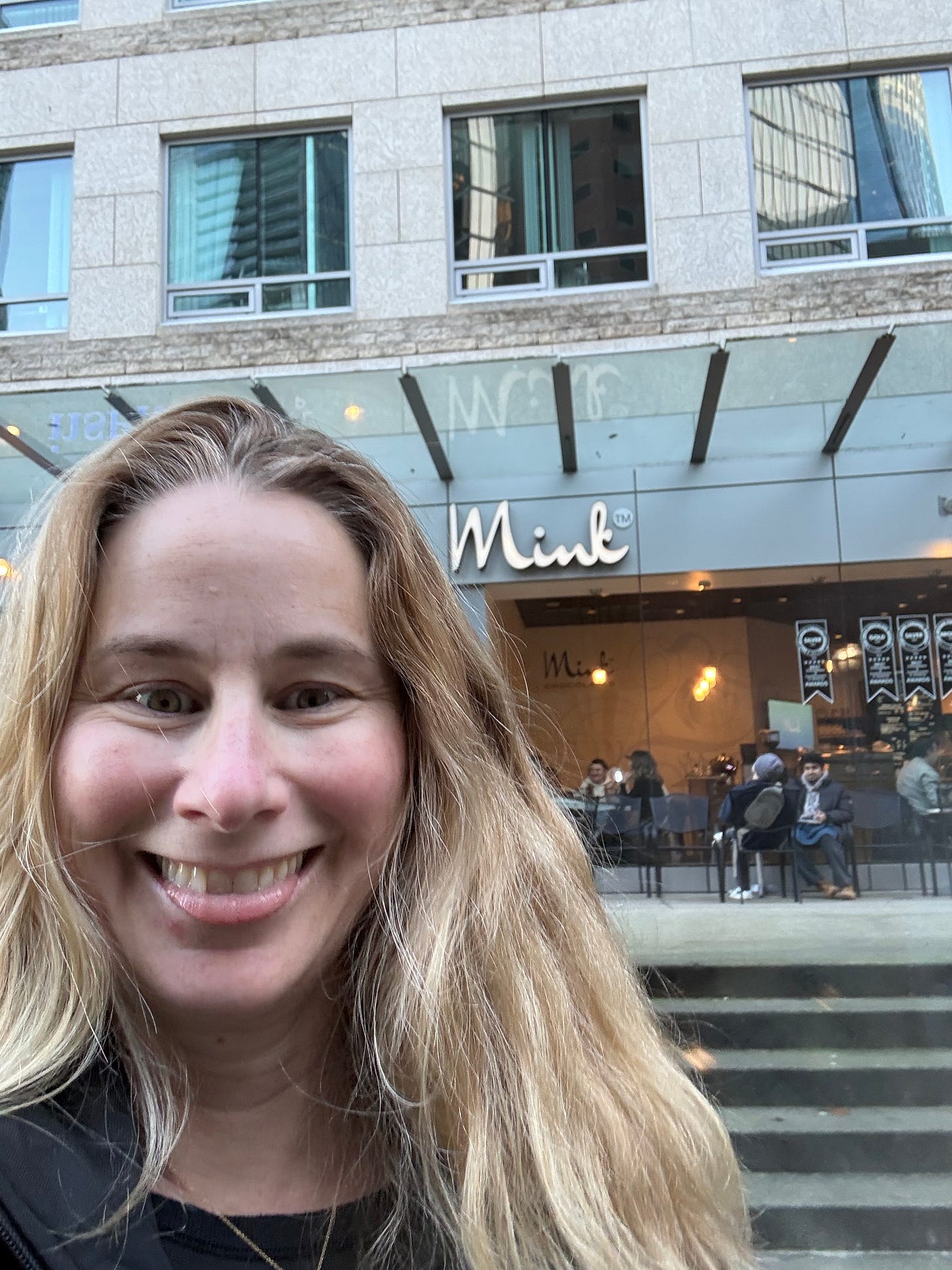 P.S. This is me in Vancouver outside Mink in all my unfocused glory - literally, because my glasses were “off” the entire trip, waiting for the optician to make my actual progressive frames. The tongue out is my teenager’s influence (she does this on Snapchat, and I copy what I really love the taste of) - which in this case is CHOCOLATE. Their drinking chocolate is YUM!