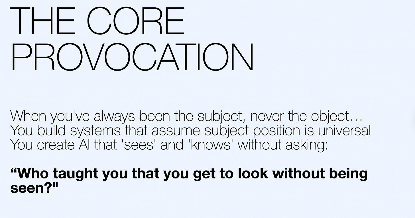 In my less optimistic moments, I think the people designing the studies are the same people who built the systems—people who’ve always been the subject, never the object. People who create AI that “sees” and “knows” without ever asking: “Who taught you that you get to look without being seen?”