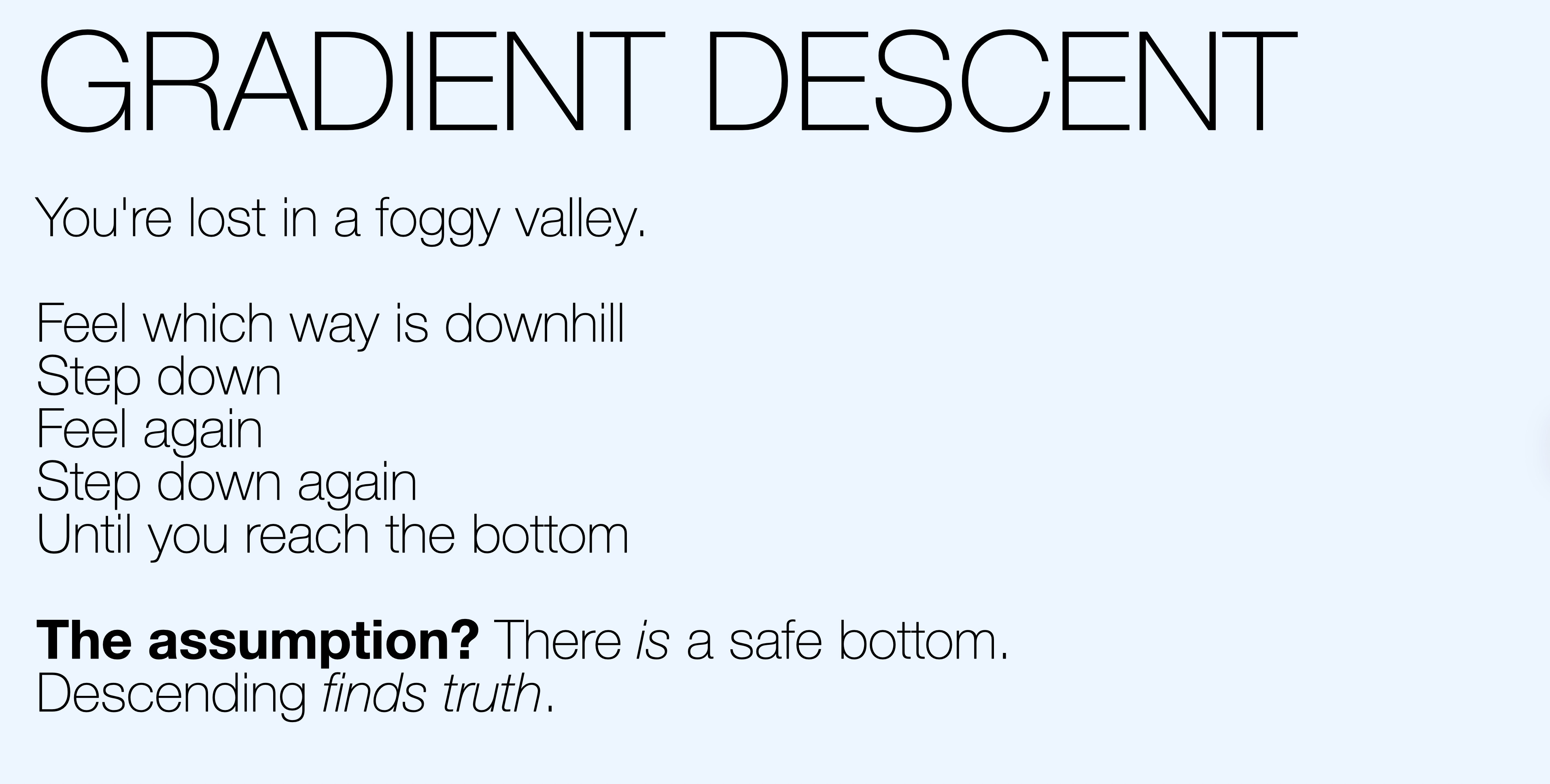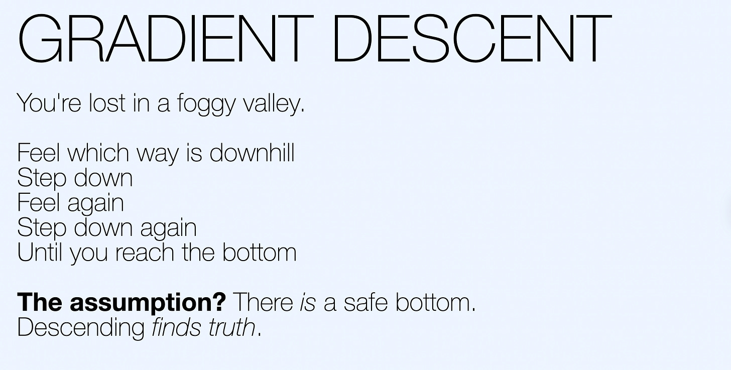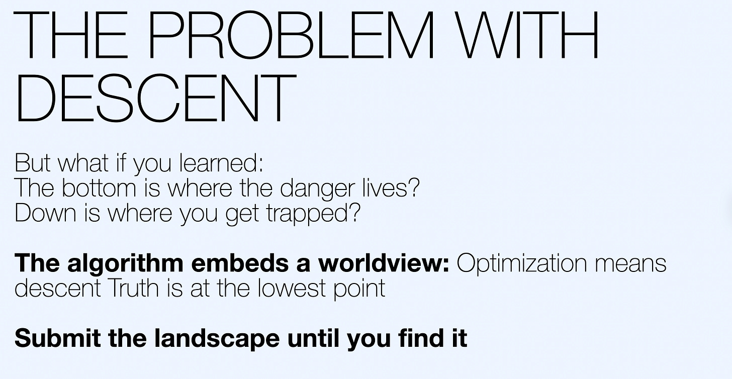Beth calls this out brilliantly: gradient descent embeds a worldview. It assumes descending finds truth. It assumes there is a bottom and that the bottom is safe.