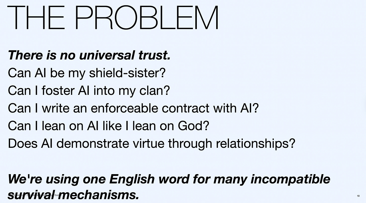 Bitachon (divine leaning), muinín (enacted kinship), fides (legal contract), xin (demonstrated virtue), traust (shield-wall reliability)—none of them map cleanly onto what’s happening when I open Claude at a conference to process what a speaker just said.